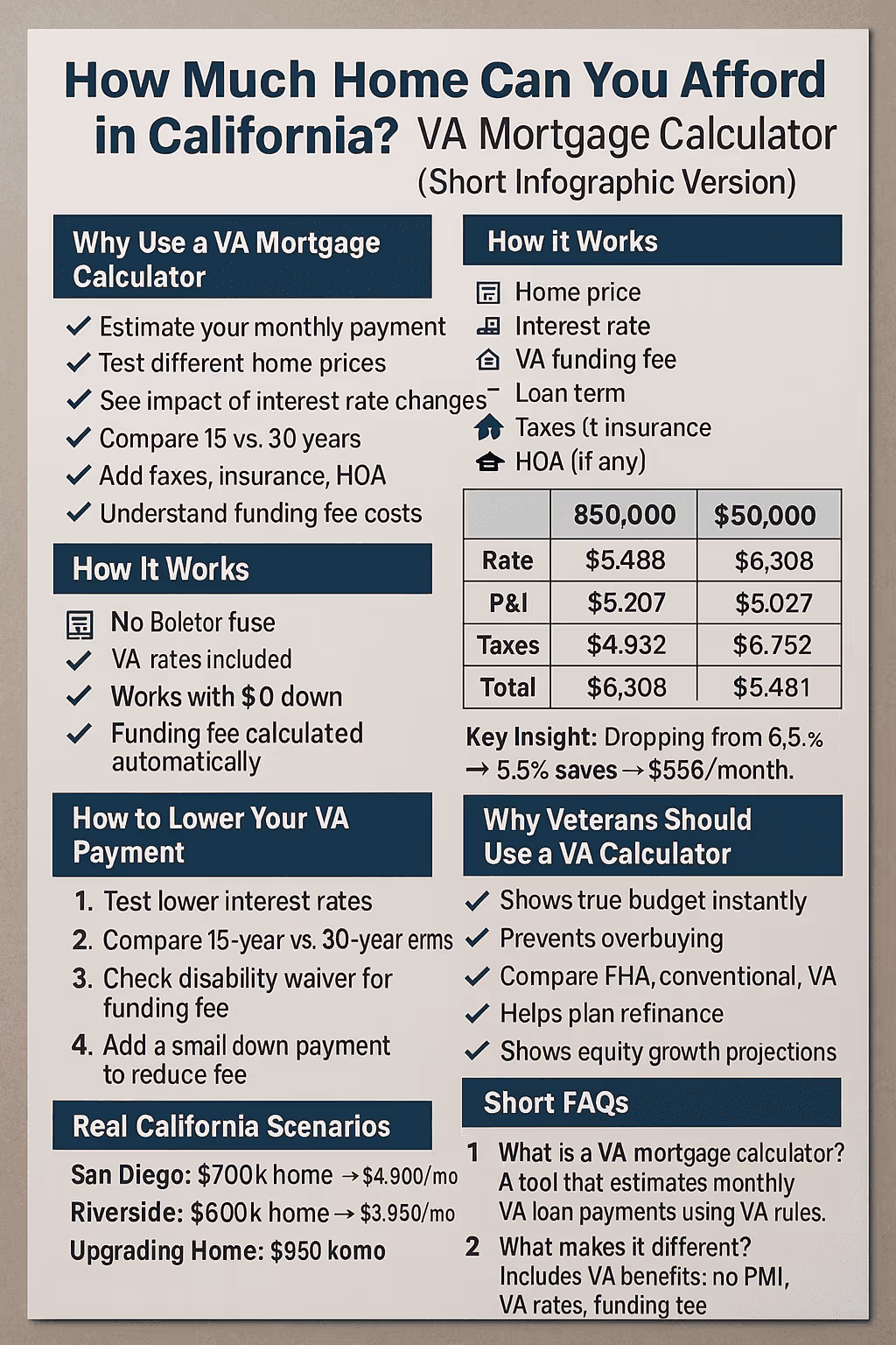 A VA mortgage calculator helps veterans estimate their monthly mortgage payment. It uses VA loan rules—no PMI, lower rates, and funding fee calculations—to give accurate results based on California home prices.