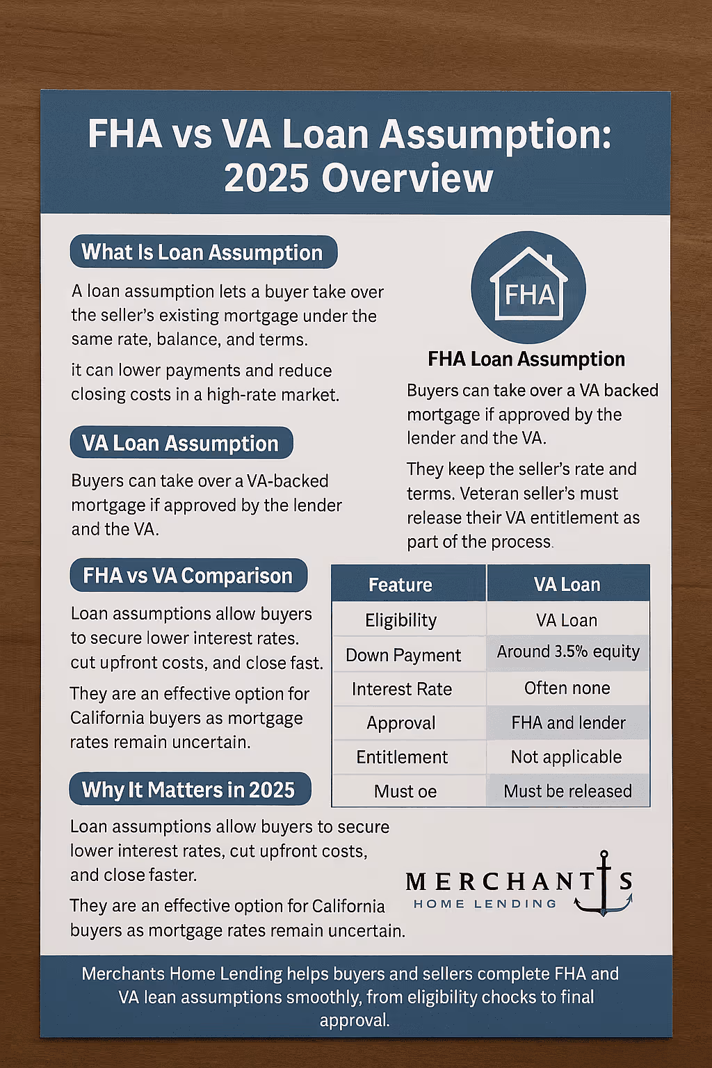 At Merchants Home Lending, we specialize in helping California buyers understand the nuances of loan assumption programs, guiding you through every step with transparency and expertise.